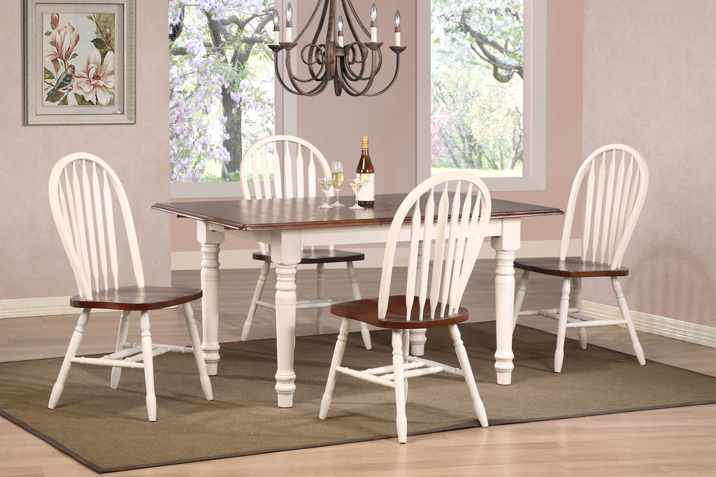 The Sunset Trading Andrews dining set features a traditional farmhouse style with a two-tone finish of slightly distressed antique white and chestnut brown.