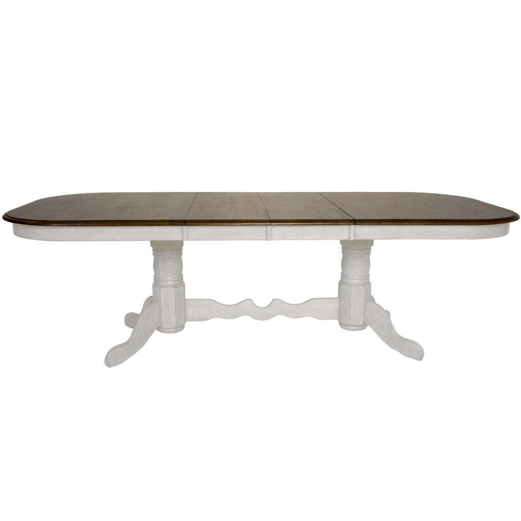 The Sunset Trading Andrews dining table measures 96 inches in length when fully extended, and it can be adjusted to three sizes using the two self-storing 14-inch leaves.