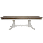 This dining table is constructed from Malaysian oak and features a distressed antique white and chestnut brown finish with natural wood grain color variation.