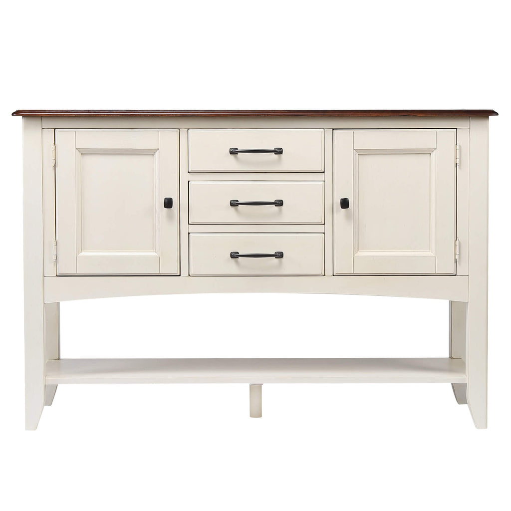 The sideboard features a distressed white and chestnut brown color combination, enhancing its rustic and vintage appeal.