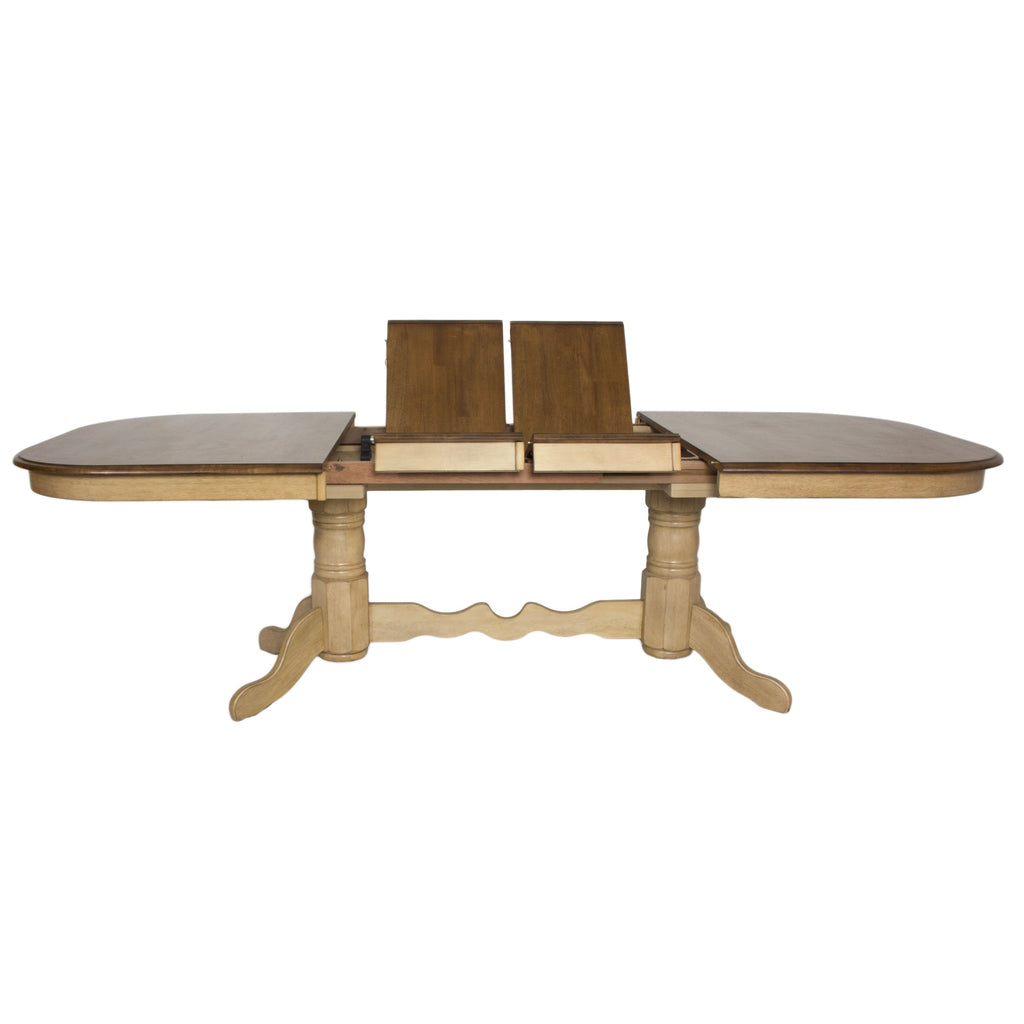 The dining table and chairs have a distressed two-tone finish in light creamy wheat with warm pecan brown.