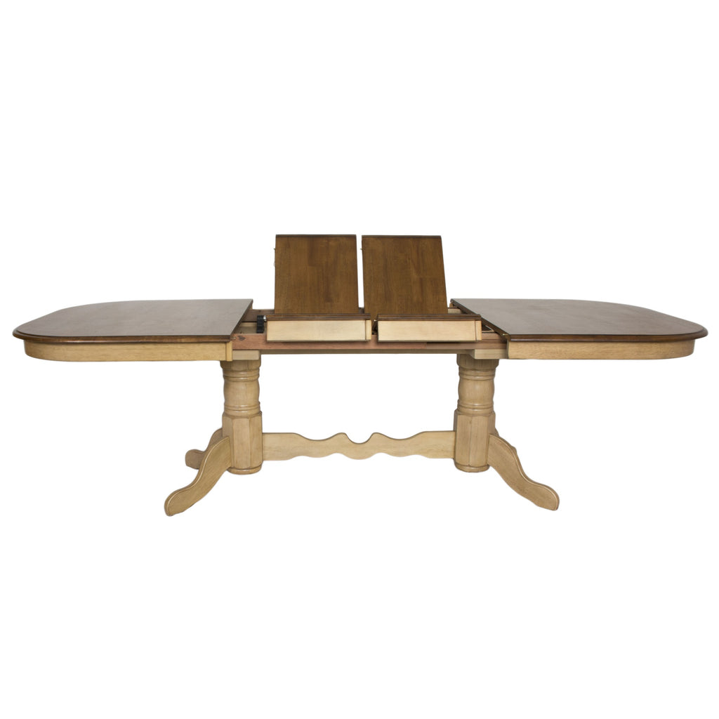 The dining set has a distressed two-tone finish in light creamy wheat with warm pecan brown accents.