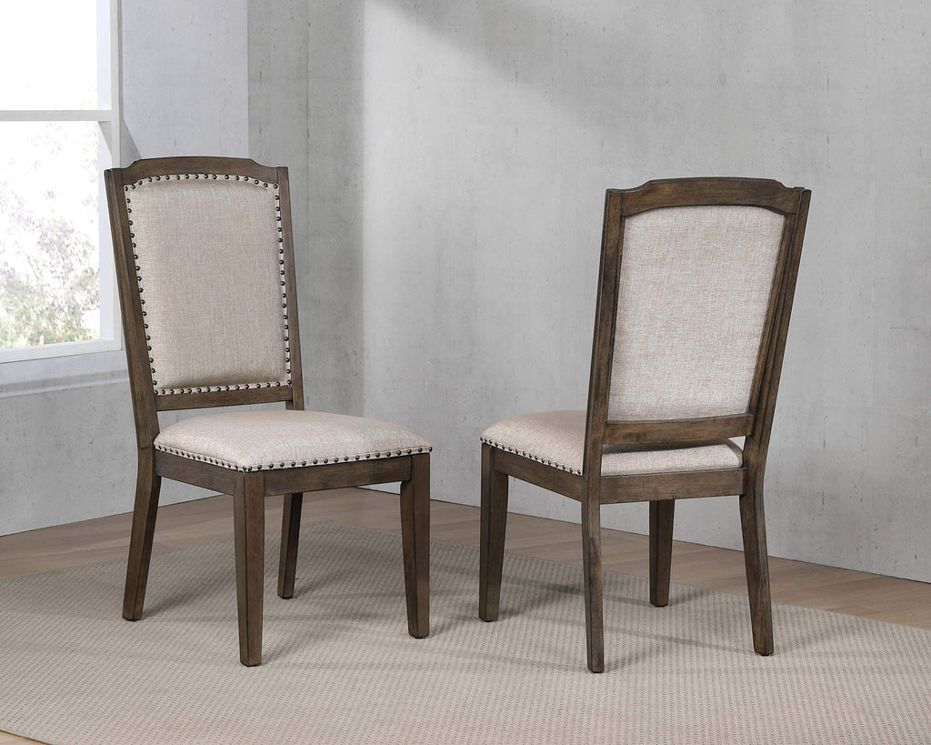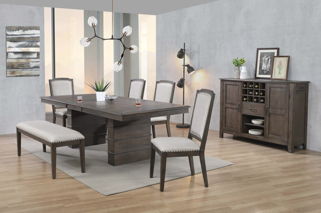 The Sunset Trading Cali Dining Set features a blend of contemporary and rustic styles, highlighted by elegant details such as nailhead trim and a textured wood finish.