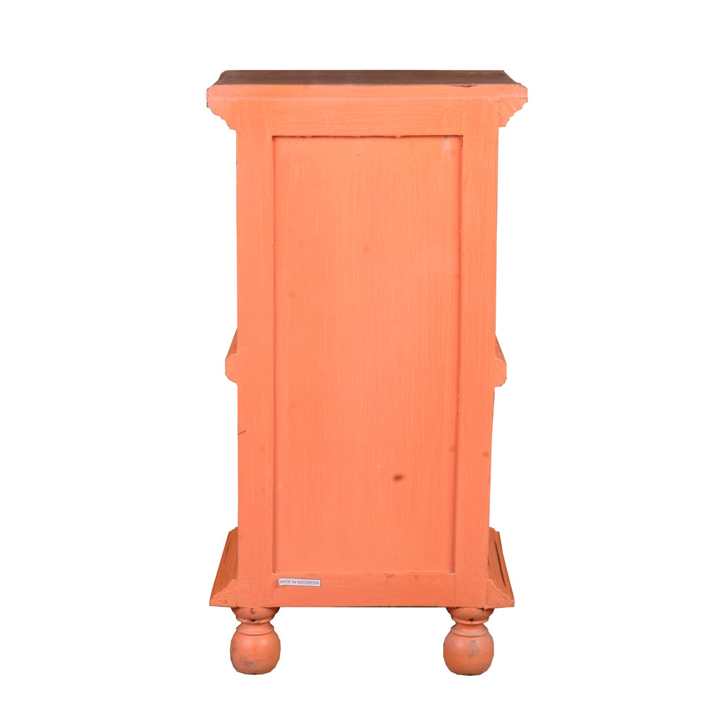 The end table is made from metal and solid recycled plantation mahogany, featuring a coral orange finish with a raftwood top and antique brass accents.