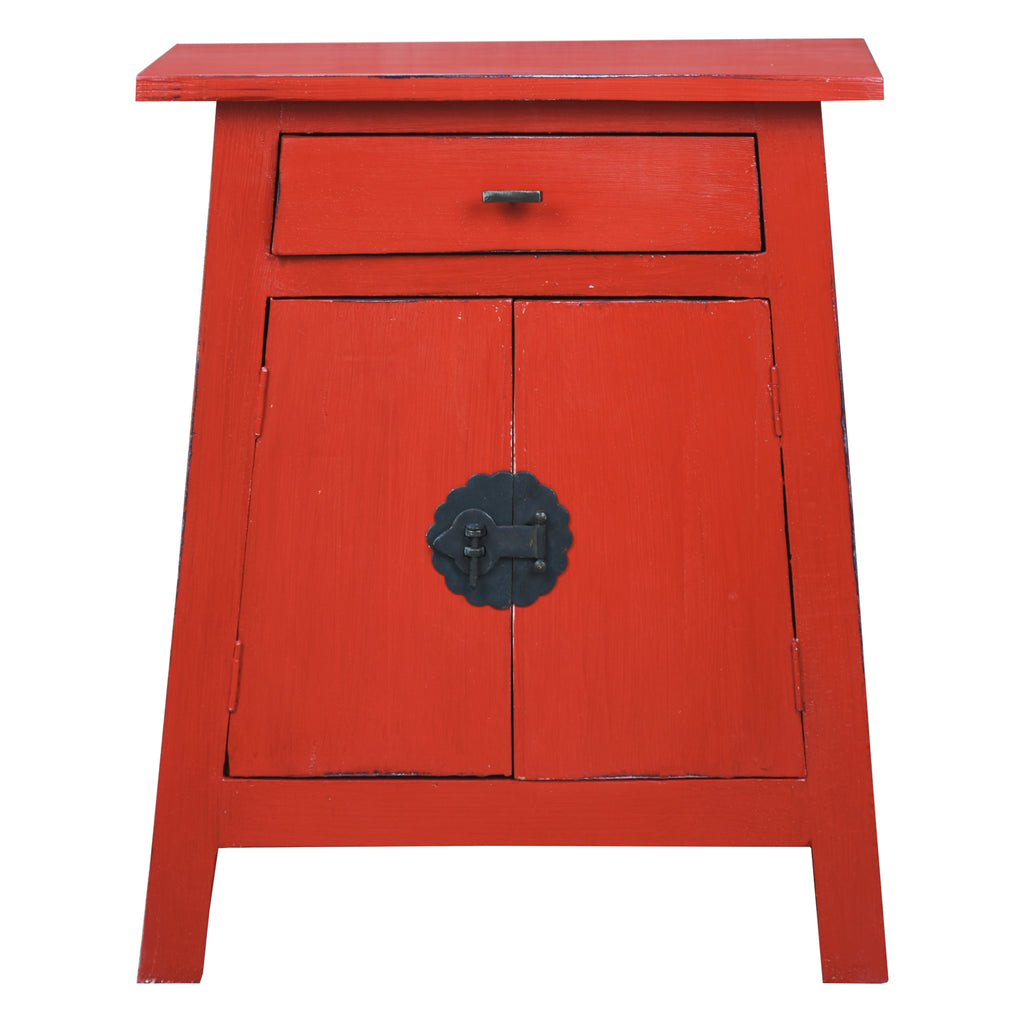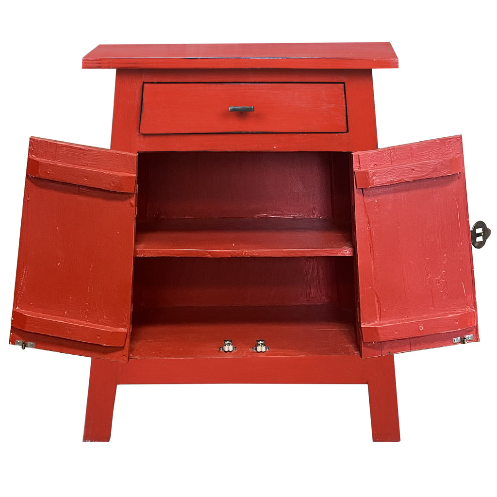 The end table has a Shabby Chic design with a lightly distressed bold red glazed finish, adding a whimsical touch to any living space.