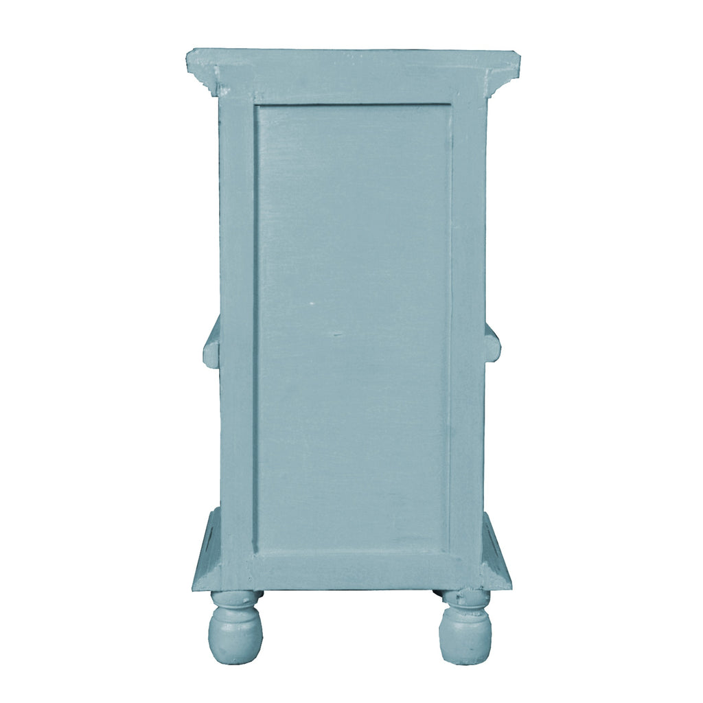 The table features a blue-green and medium brown two-tone finish with antique brass accents, designed to match various home decorating themes.