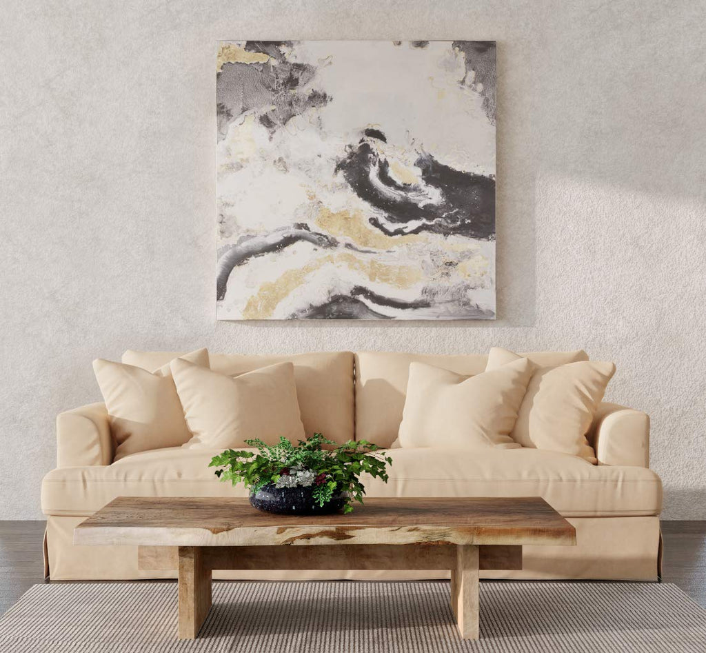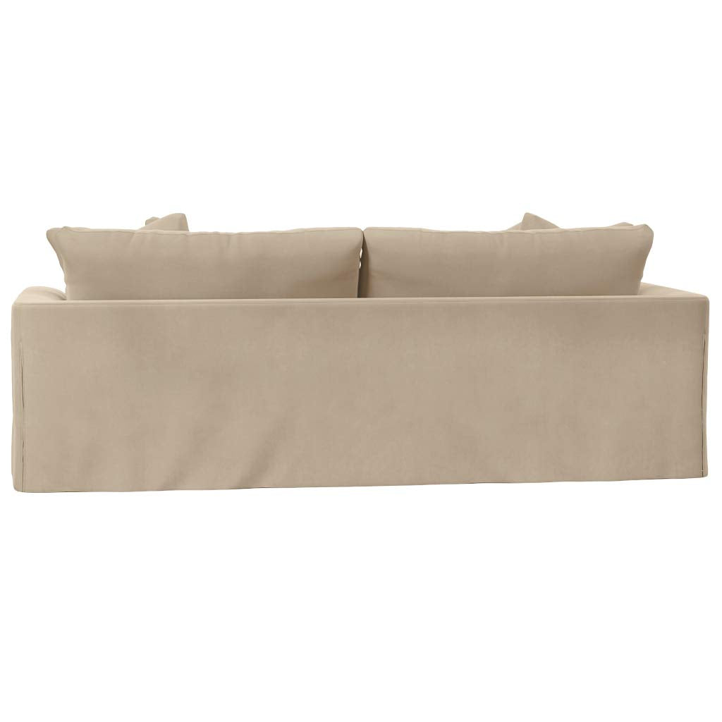 The Sunset Trading Newport Slipcovered Sofa features a high-performance fabric that combines fibers and polyester yarns, encapsulated in a stain and water-resistant finish.