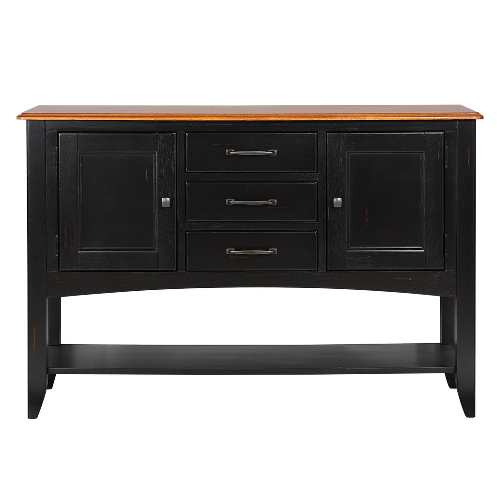 Dlu-1122-Sb-Bch Sunset Trading Selections Sideboard With Large Display Shelf | 3 Drawers 2 Storage Cabinets | Antique Black And Cherry, Traditional, Farmhouse, Mission And More Our Sideboard Buffet Has It All. This Transitional Credenza Delivers Rustic Charm While Providing Organization In Your Kitchen, Office, Entryway Or Home Bar. Ideal Storage And Display Solution With Three Spacious Drawers, Two Closed Door Cabinets And A Large Open Shelf For Baskets, Books, Dishes And Serving Plates. Perfect For Your Before, During And After Dinner Party Needs. Mix And Match With Any Black Cherry Selections Dining Piece To Create Your Perfect Space! Perfect Credenza To Keep Your Home Organized - Features 2 Large Cabinets With Adjustable Shelves, 3 Drawers And 1 Large Open Shelf With A Spacious Top For Serving And Entertaining | Built To Last: Constructed From Solid Kiln Dried Malaysian Oak Also Known As Rubberwood | Matte Lacquer Preserves The Natural Grain Patterns Adding Protection From Moisture And Daily Wear And Tear | Free Wood Samples Simply Email Info@Sunsettrading.Com | Stunning Antique Black With Cherry Rub Enhances The Cherry Top For A Warm Curated Look | Quality Details - Three Smooth-Gliding, Dovetail Construction Drawers With Felt Lined Top Drawer | High End Antique Black Metal Hardware Will Update Your Home In A Flash | Versatile Function - Use As A Server Buffet In Kitchen Or Dining Room, Use As A Tv Console Cabinet In Your Living Room, Bathroom Or Office To Display As Well As Store Items | Safety & Durability- Use Anti-Tip Kit Toattachtothewall If Desired, One Piece Frame To Legs With Floor Protectors Enhance Stability | Simple Assembly - Simply Attach Handles, Attach Legs And Bottom Shelf, Add Cabinet Shelves, All Tools And Hardware Included. Made In Malaysia