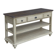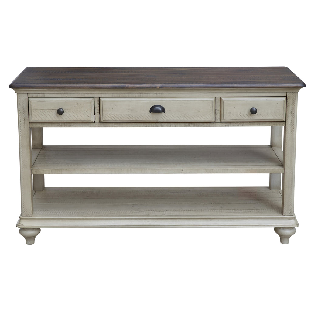 The Sunset Trading Shades of Sand Wood Console Table features three drawers and two shelves.