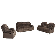 The Sunset Trading Oxford Reclining Living Room Set is made from a hardwood frame, covered in micro suede fabric, and includes plastic components.