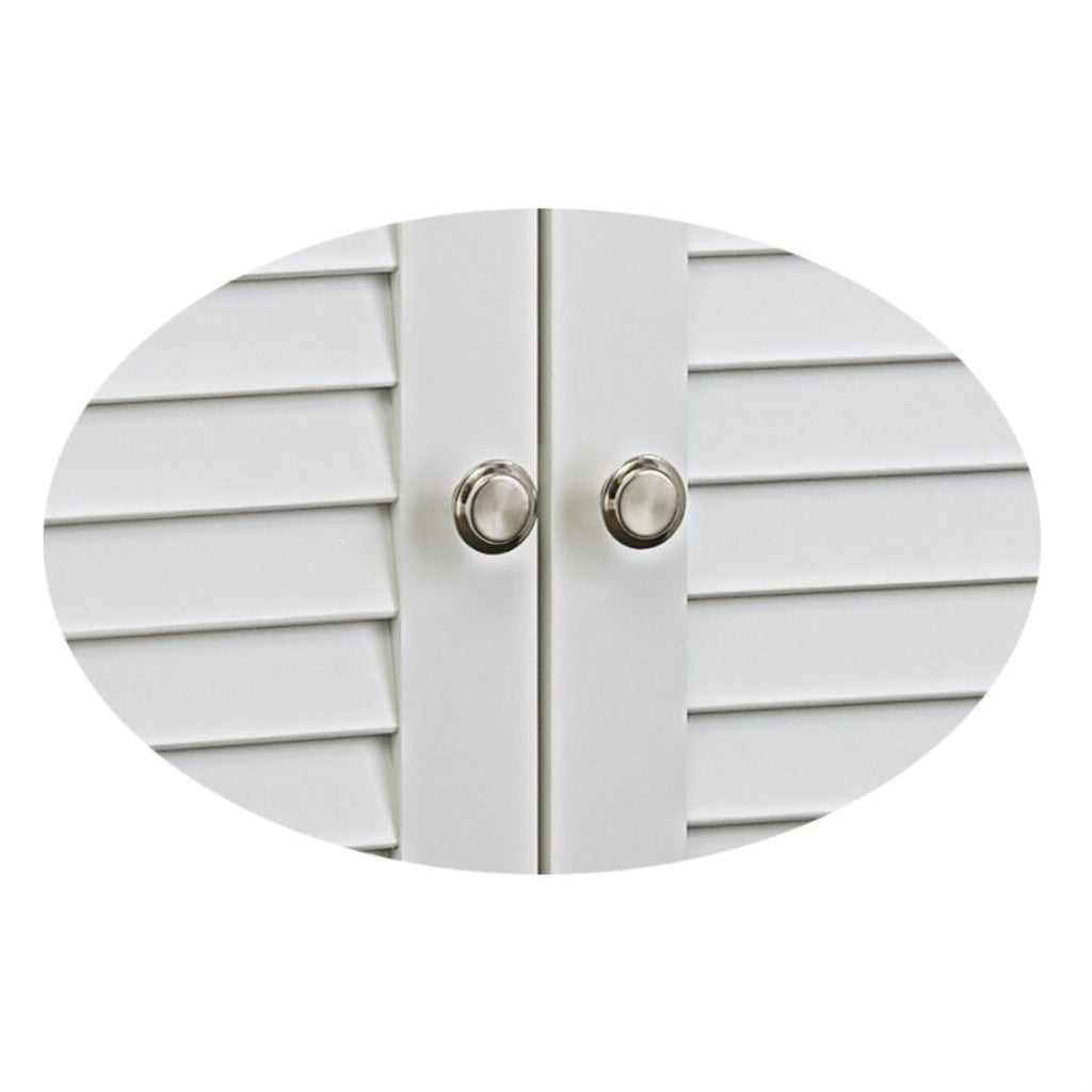 The adjustable shelf behind the doors has an interior storage size of 25.5 inches wide, 7 inches deep, and 18.5 inches high.