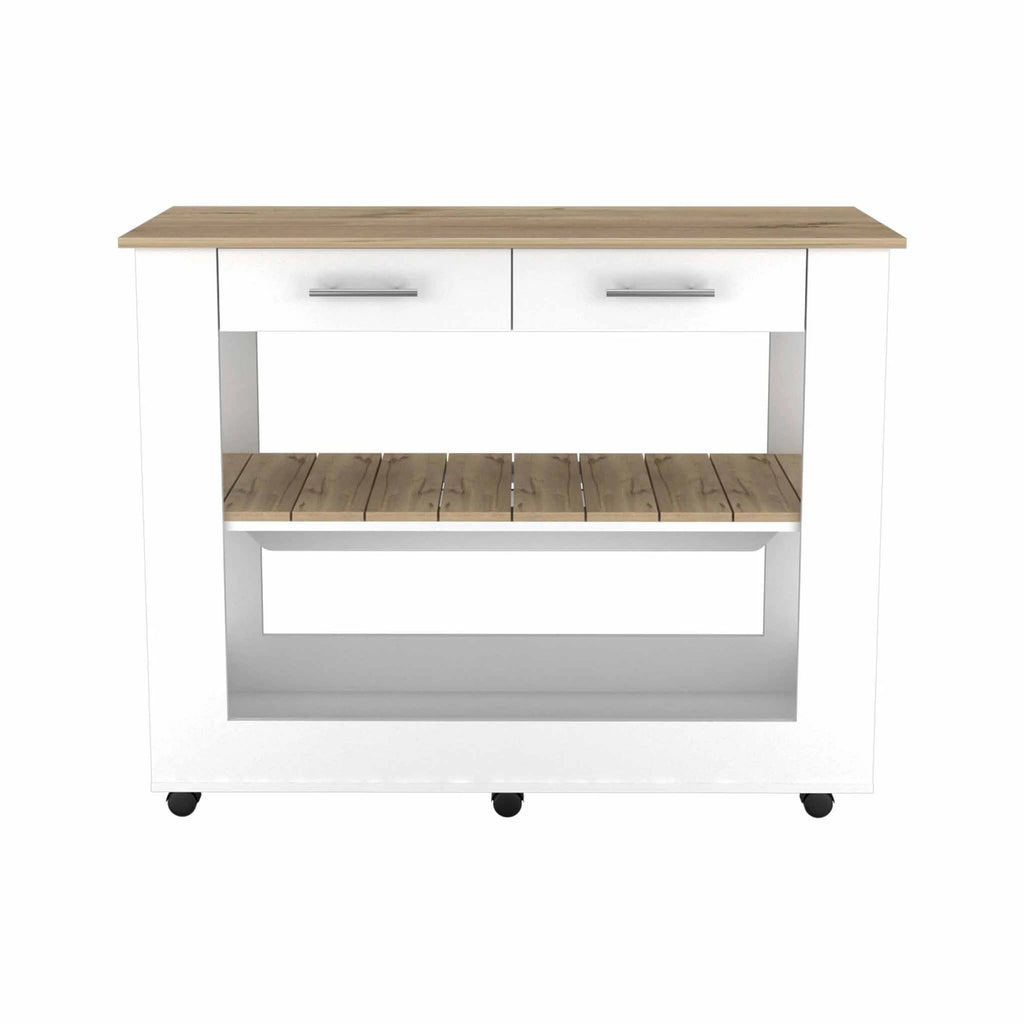 The Tuhome Cala 46 Kitchen Island Brings Style And Functionality To Your Kitchen Space. Unique Features Will Make This Piece Your Most Trusted Allied On Your Kitchen, Featuring: A Large Tabletop (20 Width By 45.9 Length) Will Provide A Spacious Area For Dining, Assist You During Your Meal Prepping Or Provide Ample Space To Display Your Dcor. Two Drawers On The Front And One On The Side Will Cover All Your Storage Needs. Two Open Shelves Located In The Middle And Bottom Of The Island Are A Great Place To Put Your Pots, Pans, And Larger Items. Six Casters With A Locking Mechanism Will Allow You To Move It Around Wherever You May Need It. Product Dimensions Are 20 W X 36.5 H X 45.9 L. It Is Made Of Particle Board With A White And Light Oak Finish.