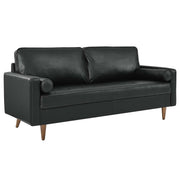 The Valour sofa is upholstered in high-quality top grain leather, providing both durability and a luxurious look.