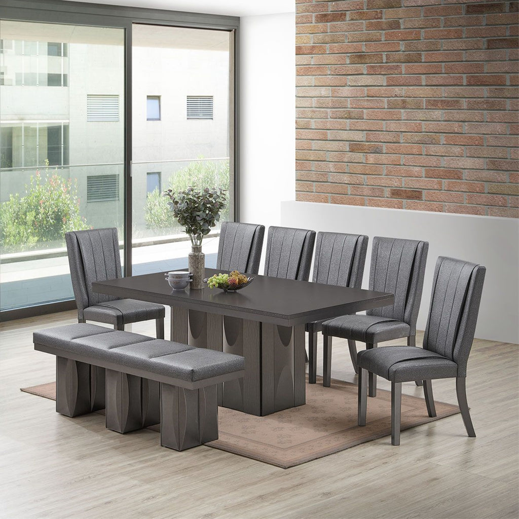 Voight 8 Piece Pedestal Dining Set, Gray Wood & Vinyl (Table, 6 Chairs, Bench).