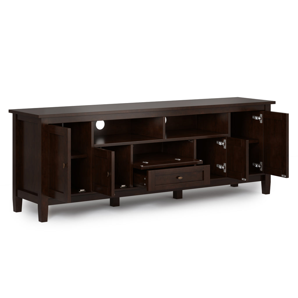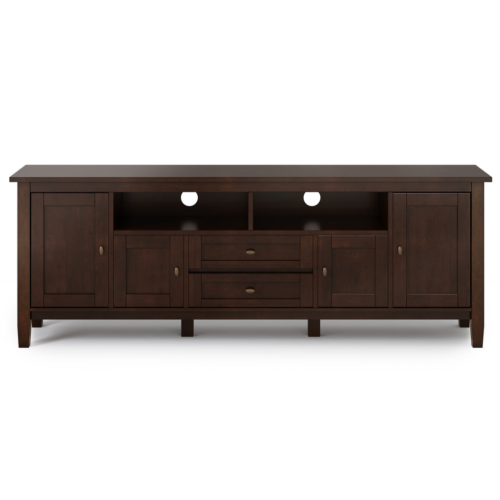 The dimensions of the SIMPLIHOME Warm Shaker TV Stand are 17.5 inches deep, 72 inches wide, and 26 inches high.