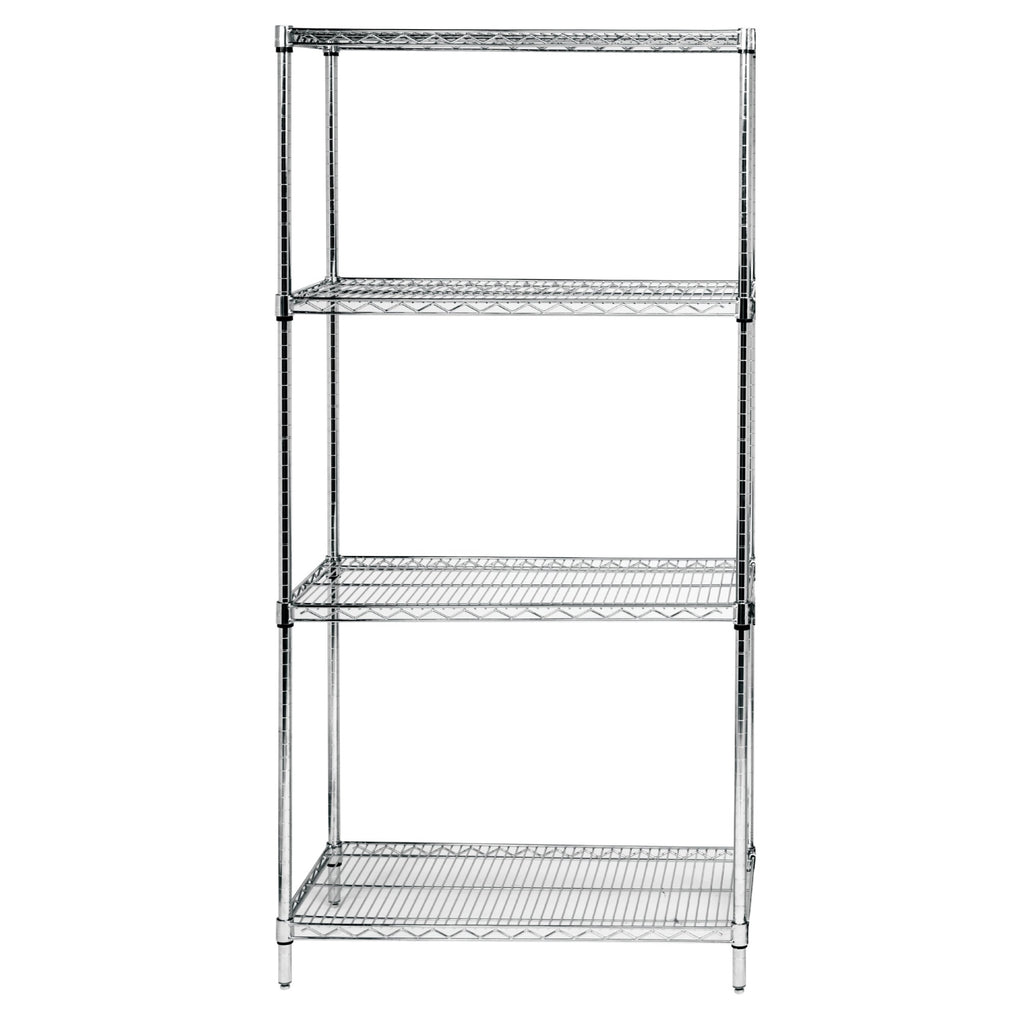The Quantum Storage Systems Wr63-2448S Starter Kit Includes Four Wire Shelves, Four Posts, And Split Sleeves For The Assembly Of One Modular Four-Tier Wire Shelving Unit. Its Open Wire Design Offers Visibility Of Contents, Permits Air Circulation In The Work Environment, And Helps Resist Dust Build-Up. The Shelves And Posts Are Made Of Electropolished 304 Stainless Steel For Strength And To Resist Corrosion. The Wire Shelves Adjust In 1 Increments To Accommodate Items Of Varying Heights, And Have A Welded Construction Reinforced With Wire Trusses And Struts For Strength. The Posts Are Grooved At 1 Intervals To Help Guide Installation Of The Shelves At Desired Heights, And Come With Adjustable Levelers To Facilitate Use On Uneven Surfaces. Split Sleeves On The Posts Hold And Support The Shelves. This Starter Kit Has Been Manufactured To Meet National Sanitation Foundation/American National Standards Institute (Nsf/Ansi) Standard 2 For Use In Food Handling And Processing, Dry Storage Only.The Assembled Shelving Unit Measures 63 X 48 X 24 Inches (H X W X D). (H Is Height, The Vertical Distance From Lowest To Highest Point; W Is Width, The Horizontal Distance From Left To Right; D Is Depth, The Horizontal Distance From Front To Back.) It Has An 800 Lb. Per Shelf Capacity When The Weight Is Evenly Distributed Across The Shelf. Assembly Instructions Are Included, And No Tools Are Required.Quantum Storage Systems Manufactures Storage Bins And Systems, And Steel And Wire Shelving. The Company Is Headquartered In Miami, Fl. Whats In The Box? (4) Wire Shelf, Stainless Steel, 1 X 48 X 24 (H X W X D) (4) Post, Stainless Steel, 63 (H) (16) Split Sleeve