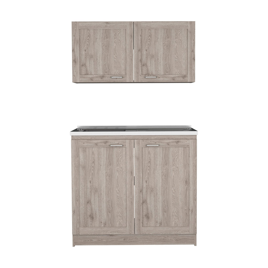 The cabinet set features ample storage with two interior shelves and double door cabinets, allowing for organized storage of kitchen essentials.