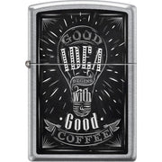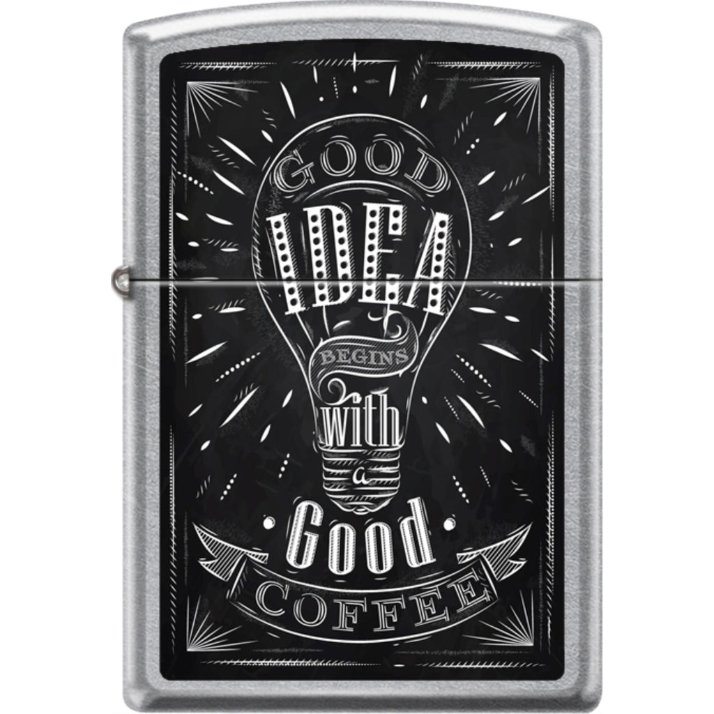 The Zippo Good Idea with Good Coffee Sign Street Chrome Windproof Lighter is a brand new, rare windproof lighter featuring a unique design that combines the themes of good ideas and coffee. It comes in original Zippo packaging and is backed by a lifetime warranty.