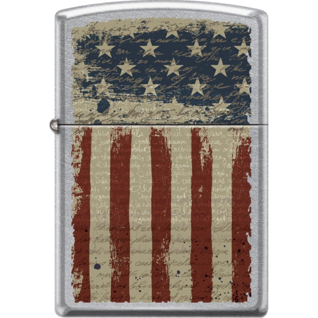 The ZIPPO Street Chrome Aged American Patriotic features a classic design that showcases an aged chrome finish with patriotic American graphics, making it a unique collectible.