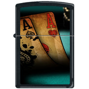 The 2013N ZIPPO 218 features a sleek black matte finish with a Double Aces design, making it a stylish and classic choice for a pocket lighter.