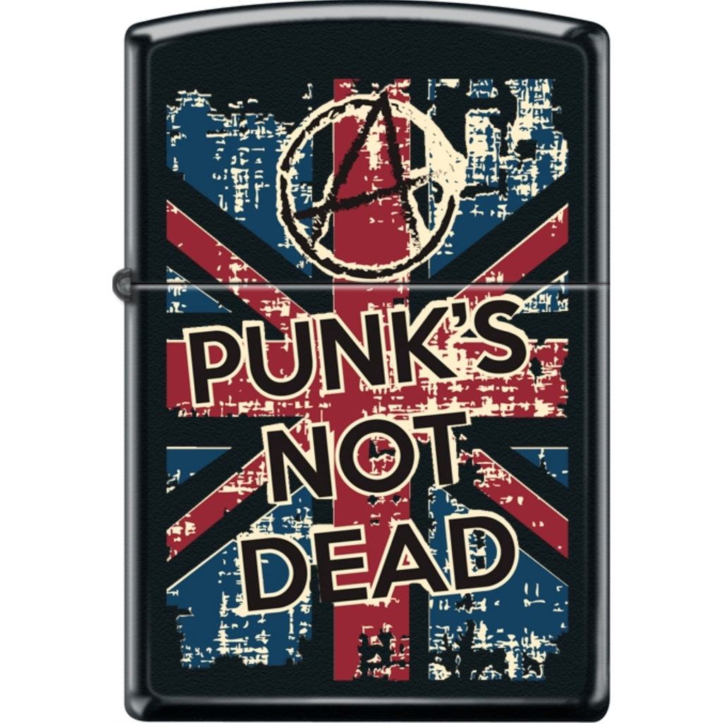 The Zippo Punks Not Dead Poster lighter is made of durable metal with a matte black finish.