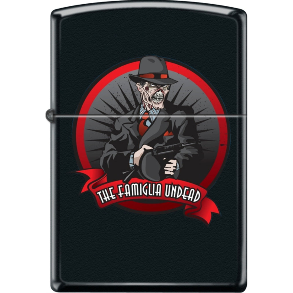 The Zippo Zombie Mobster Black Matte Windproof Lighter is a collectible lighter featuring a unique zombie mobster design. It is windproof and comes in a sleek black matte finish.