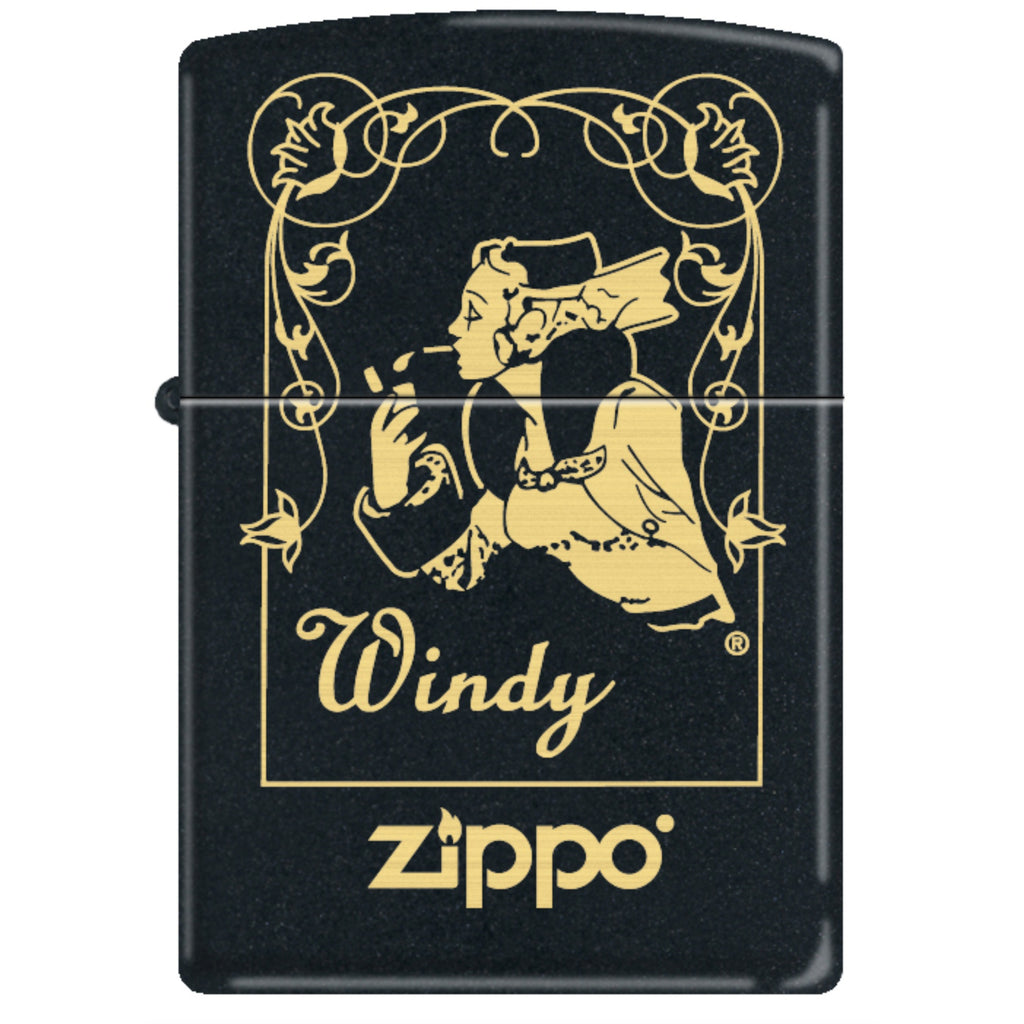 The ZIPPO 218 features a matte black finish with an original Windy Girl 'Window' design, making it a stylish and personalized accessory.