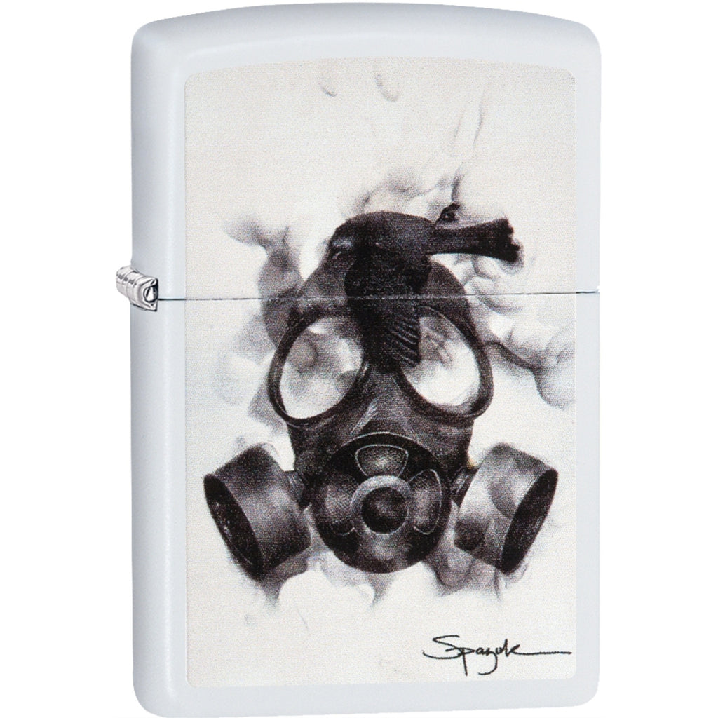 The Zippo Spazuk Gas Mask Design Pocket Lighter features an all-metal construction with a brass material, ensuring durability and a premium feel.