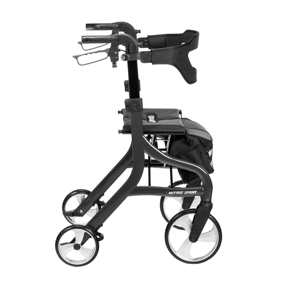 The Sleek Nitro Sprint Rollator Is Designed To Provide Comfort, Convenience And Control At Every Turn. The Rollator Sports A Unique Braking System That Reduces Tire Wear And An Integrated Slow-Down Brake For Safer Maneuverability Over Diverse Terrain. When Not In Use, The Rollator Can Be Folded Side To Side With One Hand And Locked In Place For Easy Transport. Other Features Include Multiple Storage Bag Mounting Points And A Wider Backrest With A Window For Improved Comfort And Visibility.