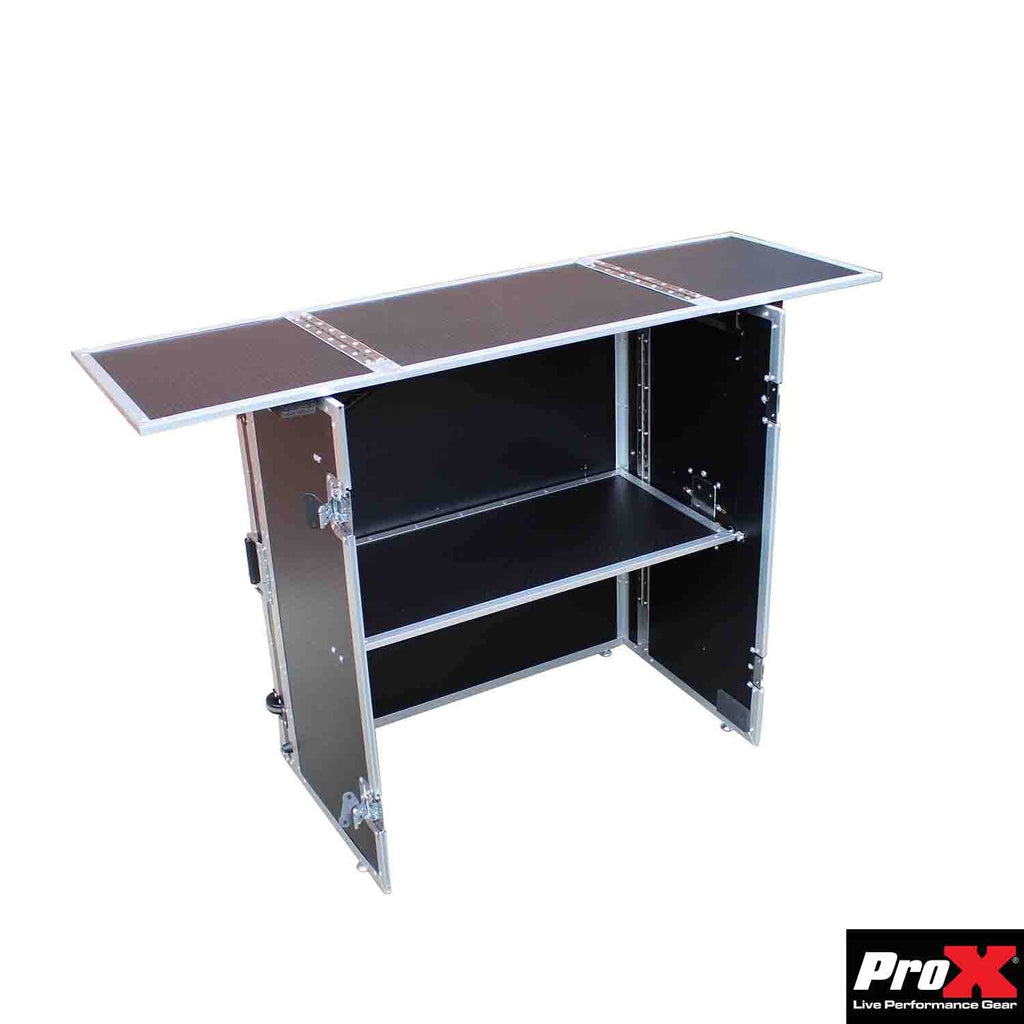 The ProX XS-DJSTN Flight Case DJ Table is designed to provide ample workspace, though exact dimensions may vary slightly based on the model. Generally, it offers a spacious surface suitable for various DJ setups.