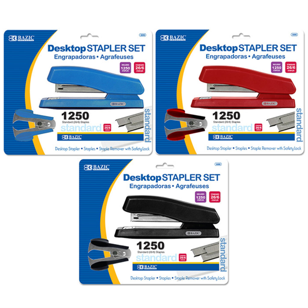 The BAZIC Desktop Stapler set includes 1 stapler, 1 staple remover, and a box of 1250 standard staples (26/6).