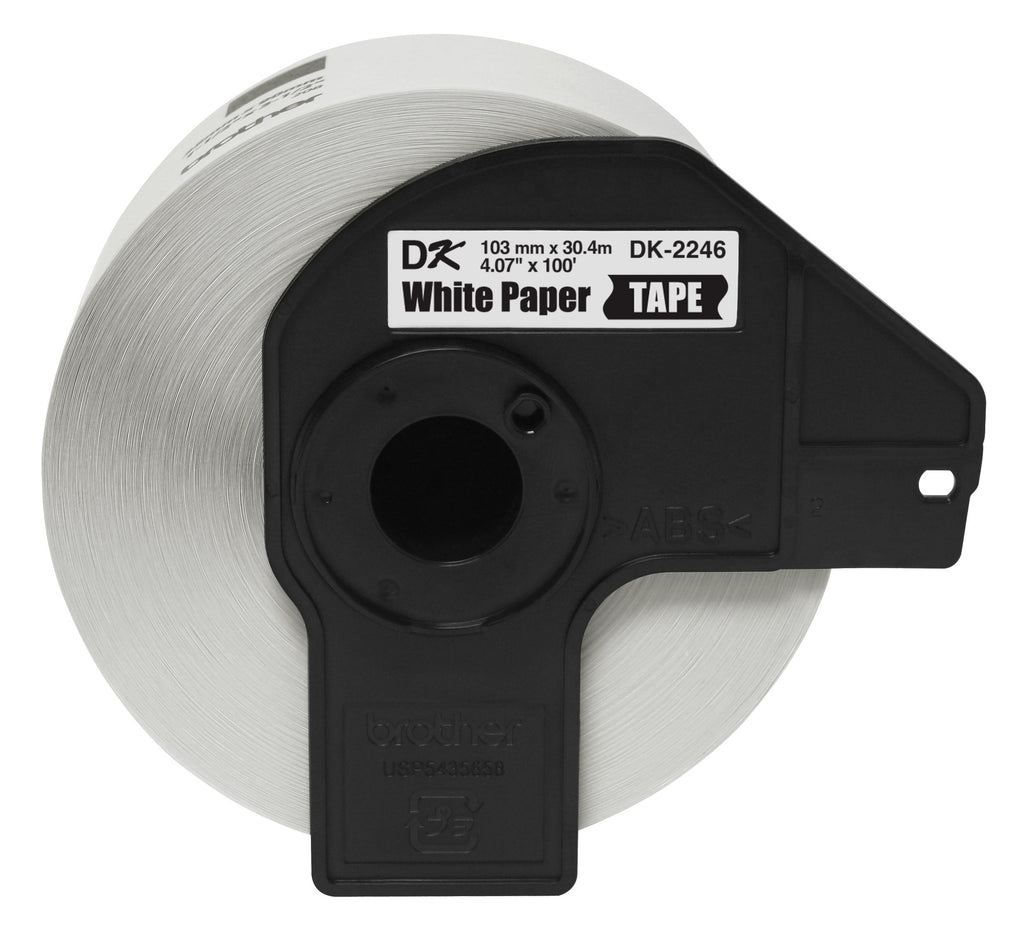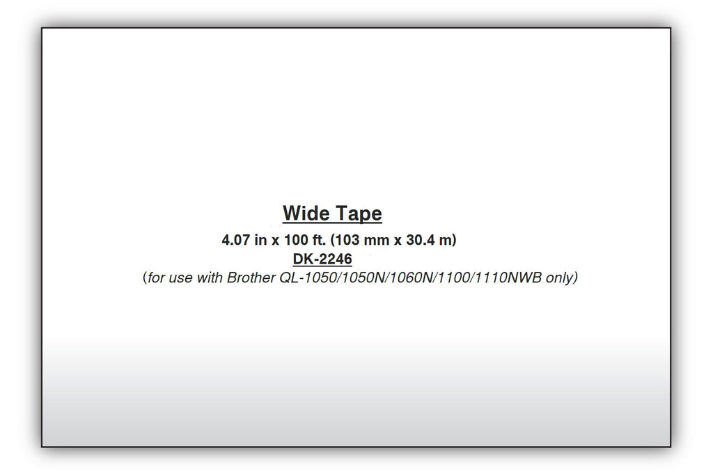 Brother Genuine DK-2246 Black on White wide format continuous length paper labels are designed to work with Brother QL-1050, QL-1050N, QL-1060N, QL-1100, and QL-1110NWB thermal label printers. All Brother Genuine DK Tapes are engineered to deliver high-quality output and reliability.The easy-to-use, drop-in DK replacement tape rolls make it a breeze to change supplies; theres no ink or toner to replace - ever. The DK-2246 continuous length label paper is ideal for postage and shipping labels, flat envelope addresses, binders, storage boxes, visitor badges, large-size packages, banners, signs and more. The continuous length paper tape can be cut to any length you need (based on the Brother QL label printer model). Roll size is 4.07x 100 (103mm x 30.4m).