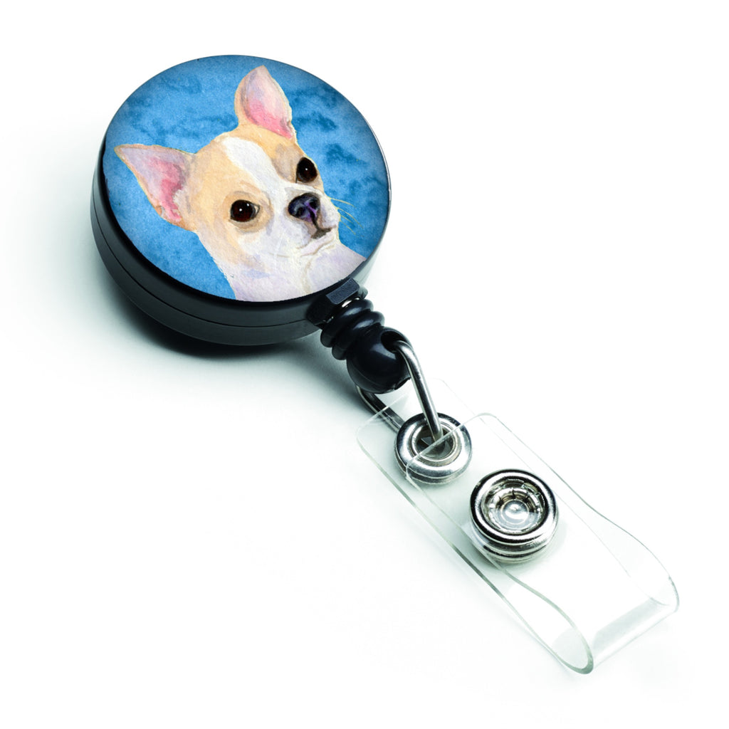 This particular badge reel features a multicolor design with Chihuahua artwork, but other designs may be available in the same product line.