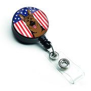 The badge reel is available in a multicolor design, featuring a prominent American flag and German Shepherd artwork.
