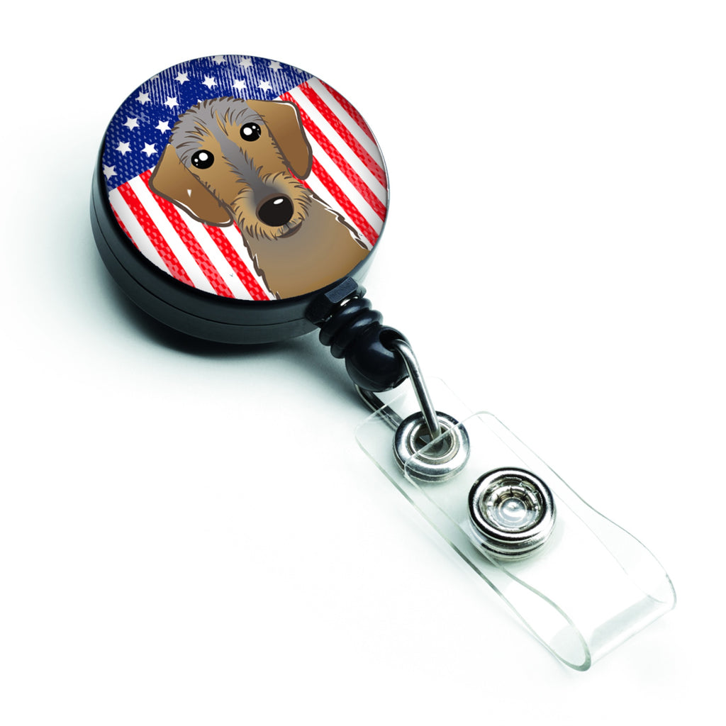 No, the artwork on the badge reel is pre-printed and not customizable; it features a specific design of an American Flag and a Wirehaired Dachshund.