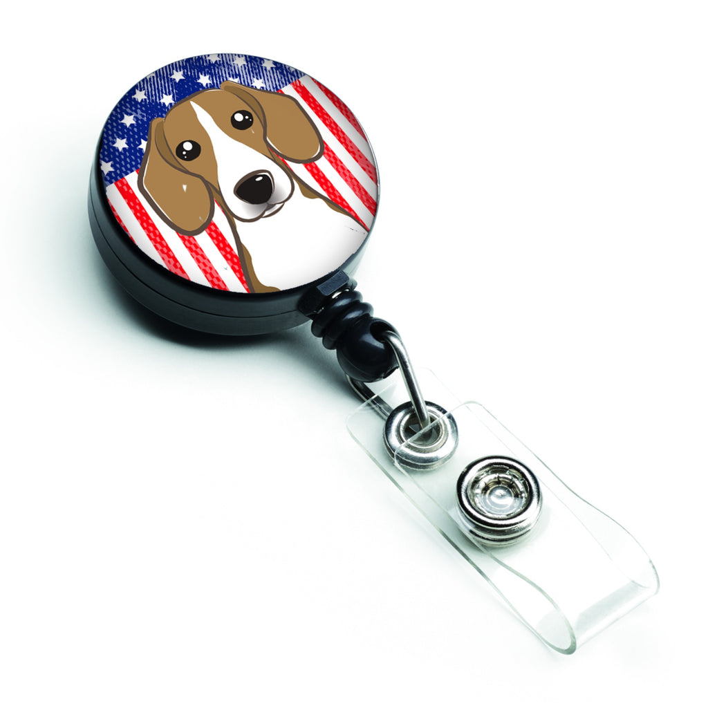 This specific badge reel features a design with an American flag and a beagle, adding a unique and stylish touch to your everyday ID holder.
