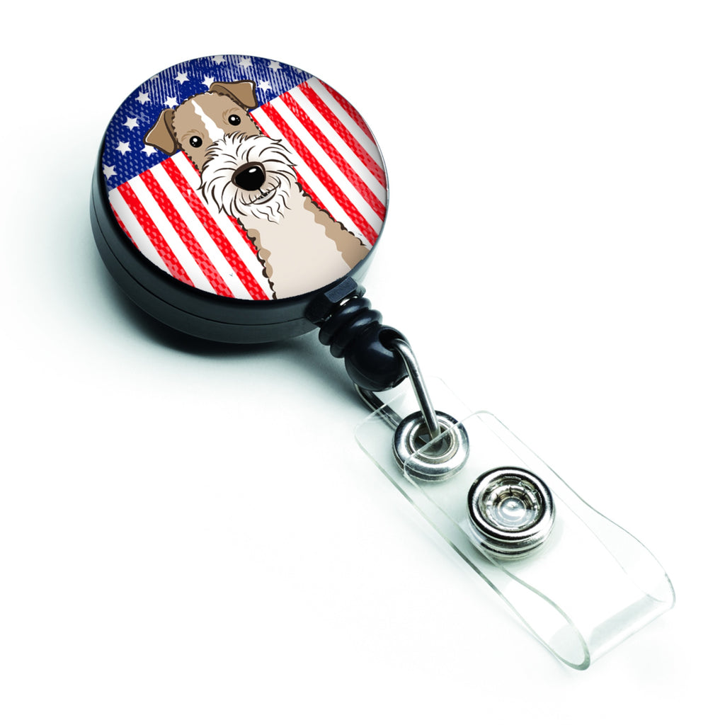This retractable badge reel features unique artwork, including designs that showcase the American flag and Wire Haired Fox Terriers, making it a stylish accessory for personal or professional use.