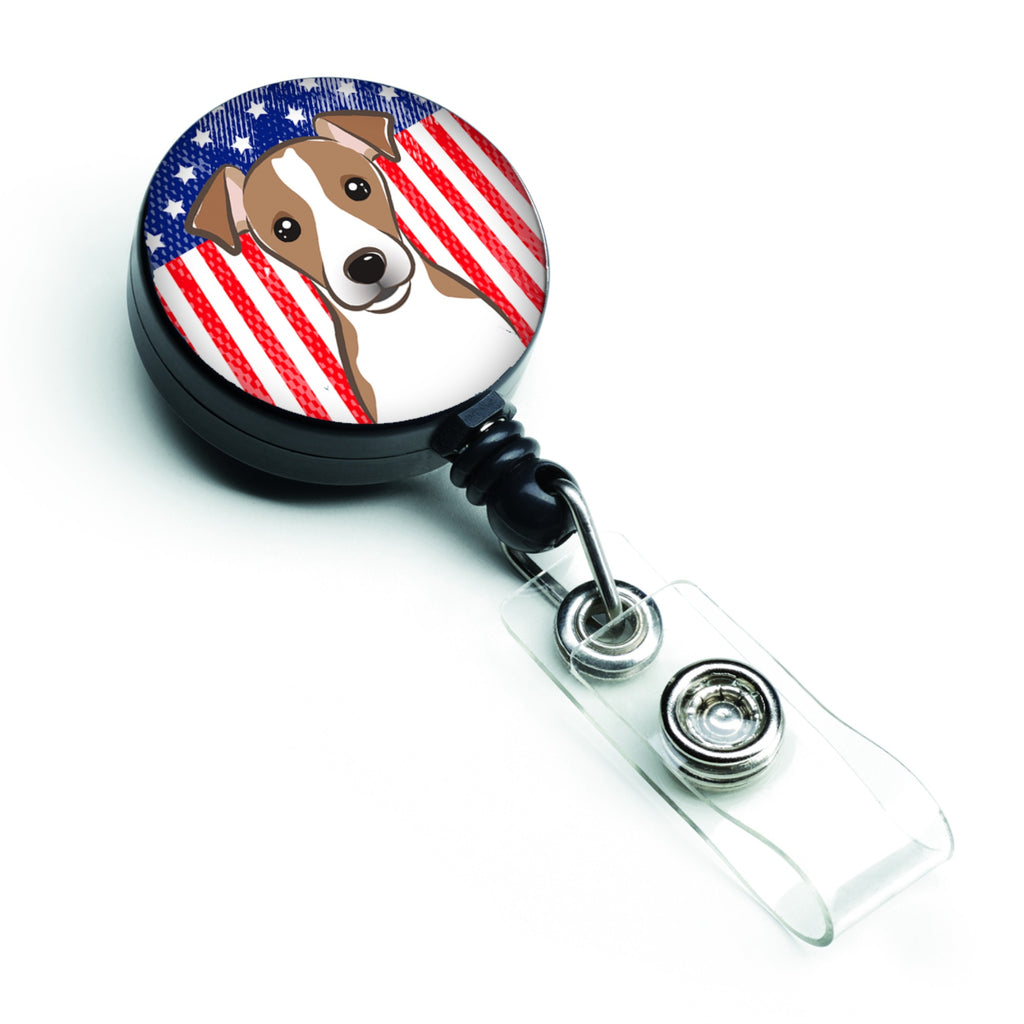 The Caroline's Treasures badge reel features a specific design highlighting the American flag and Jack Russell Terrier, but additional designs may be available from the same brand.
