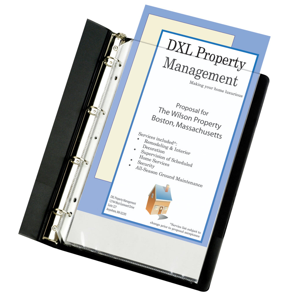Key features include strong, reinforced binding edges, a top-loading design, no sheet punching necessary, and durability due to the acid-free polypropylene material.