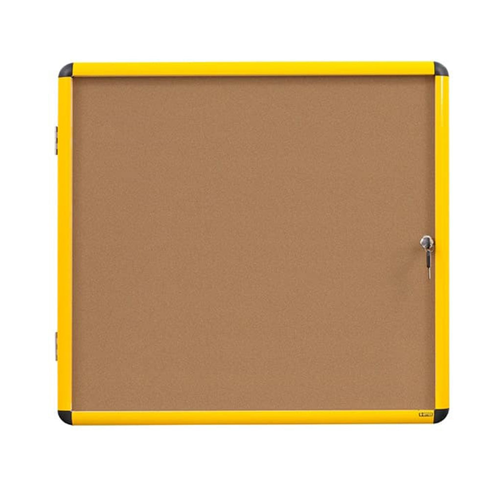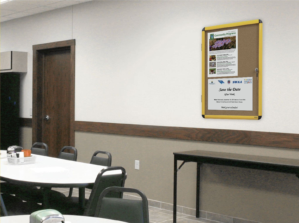 The aluminum frame of the cork board is vibrant yellow, making it highly visible in various settings.