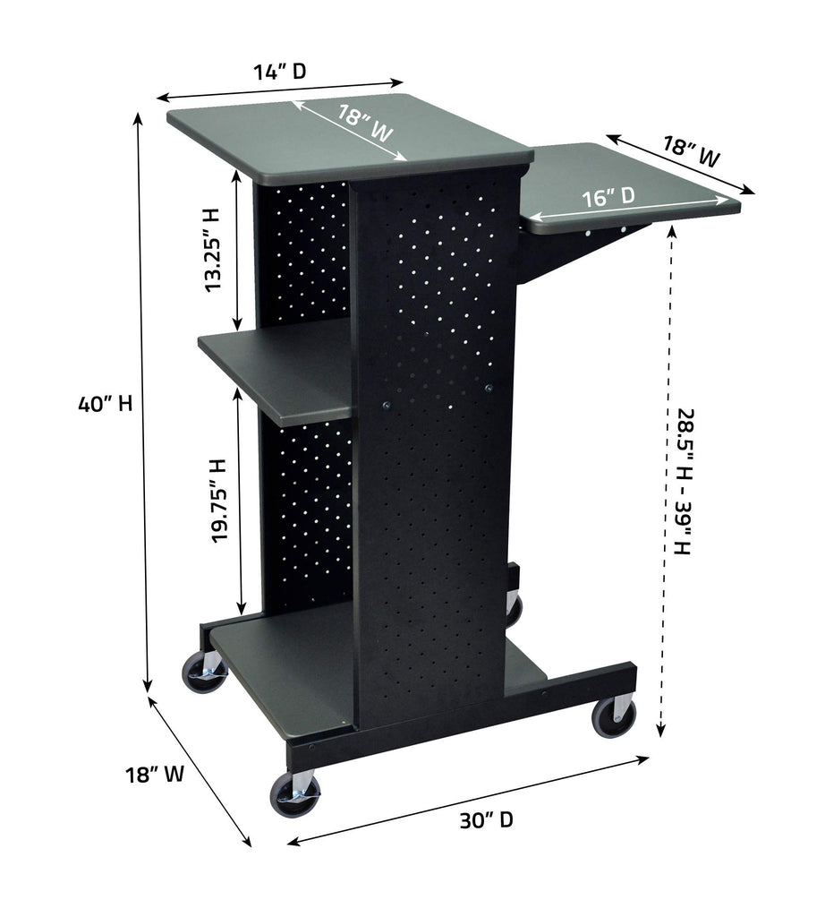 The overall dimensions of the LUXOR PS4000 are 18"W x 30"D x 40.25"H. The top shelf measures 18"W x 14"D, while the middle shelf has dimensions of 18"W x 16"D, adjustable from 28.5" to 39"H.