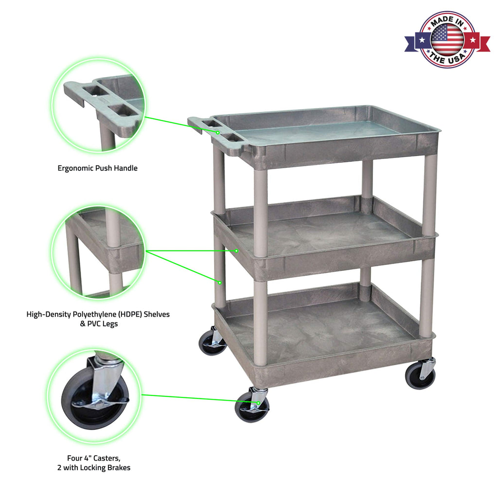 The cart features an ergonomic push handle molded into the top shelf, multiple shelf levels for easy access, and a design that ensures stability while moving, making it very user-friendly.