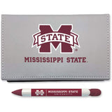 The Mississippi State Sticky Note Desk Set includes one desk set featuring six sticky note pads and one rotating message pen.