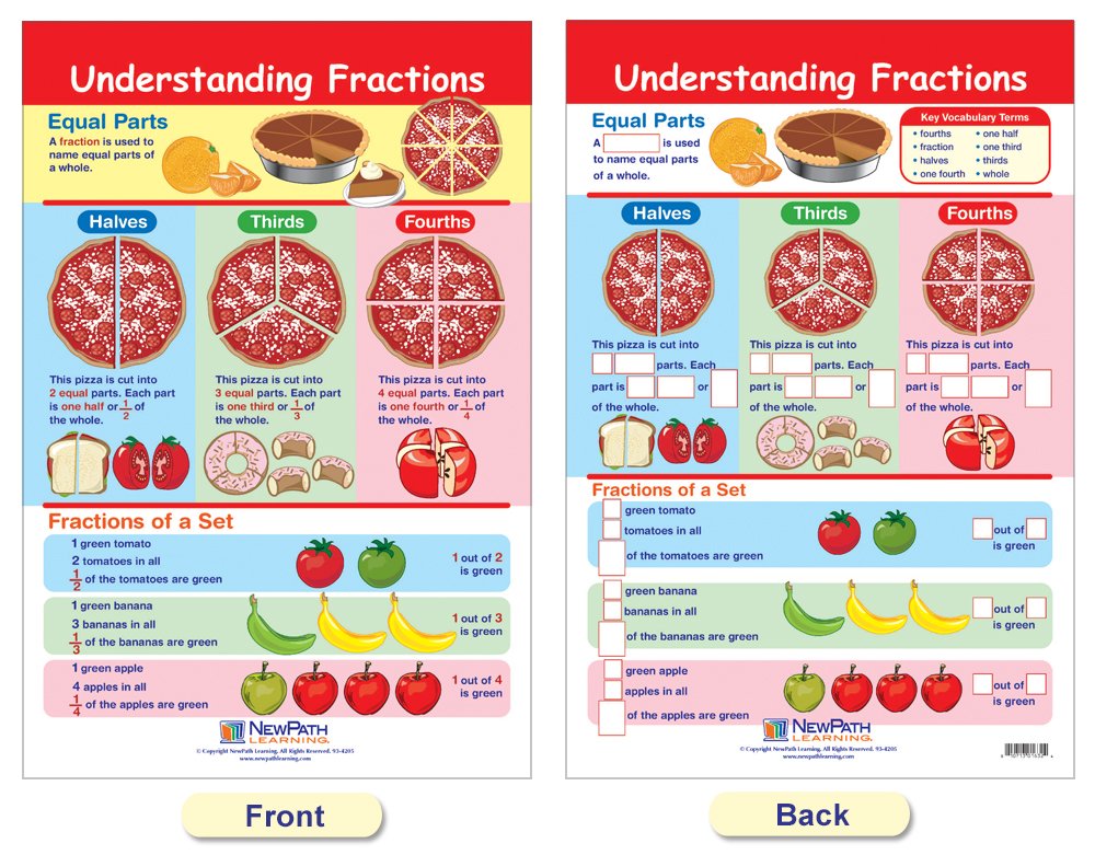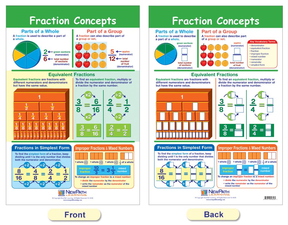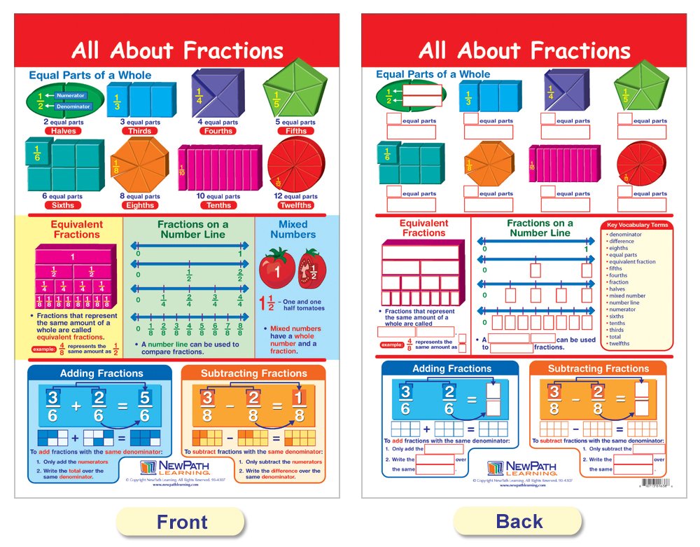 Features a collection of separate posters, each covering a separate, curriculum topic. Uniquely designed, while one side can be posted for student reference, the reverse features dry-erase activities perfect for individual student review or as a learning center activities! Graphic images and hands-on activities combine to provide comprehensive coverage of essential student skills and cover the current state and national standards - including Common Core! Each 12 x 18 Chart is laminated and double-sided - Side 1 features a graphic overview of the topic and Side 2 provides write-on/wipe-off activities. Covers Fractions; Understanding Fractions; All About Fractions; Fraction Concepts; Adding & Subtracting Fractions; Operations with Mixed Numbers; and Multiplying & Dividing Fractions.