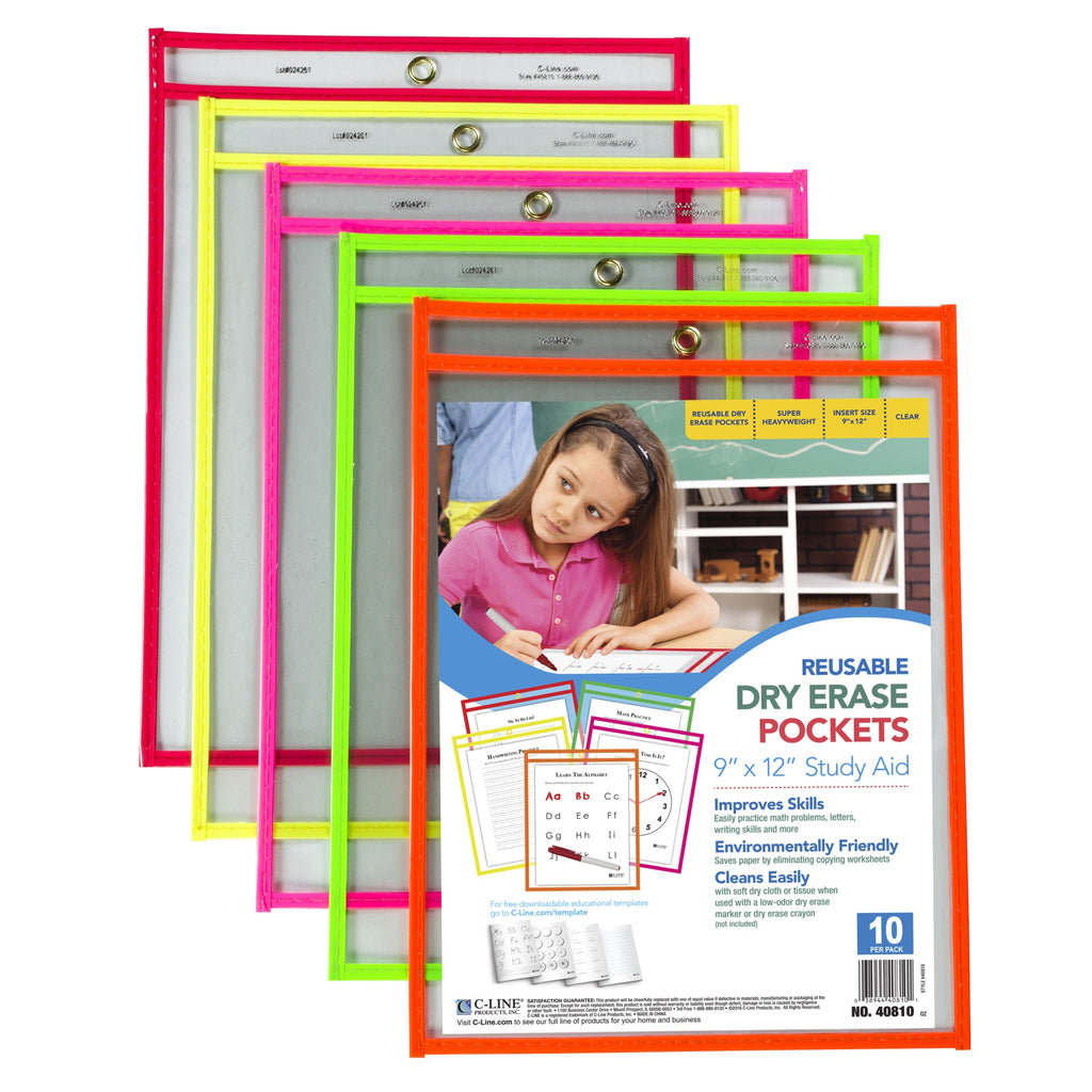 Reusable Dry Erase Pockets Help To Improve Students' Skills. Anyone Can Easily Practice Math Problems, Letters, Writing Skills And More. Helps To Save The Environment And Paper By Eliminating The Need To Copy Worksheets Over And Over Again. Reusable Super Heavyweight Pocket Lasts A Long Time. Convenient Eyelet For Hanging. Easily Clean With A Soft Dry Cloth Or Tissue When Used With A Low-Odor Dry Erase Marker Or Dry Erase Crayon (Not Included). 10/Pk. Assortment Includes 2 Each Neon Colors: Red, Orange, Yellow, Green And Pink. Insert Size: 9 X 12, Or Smaller Sized Papers.