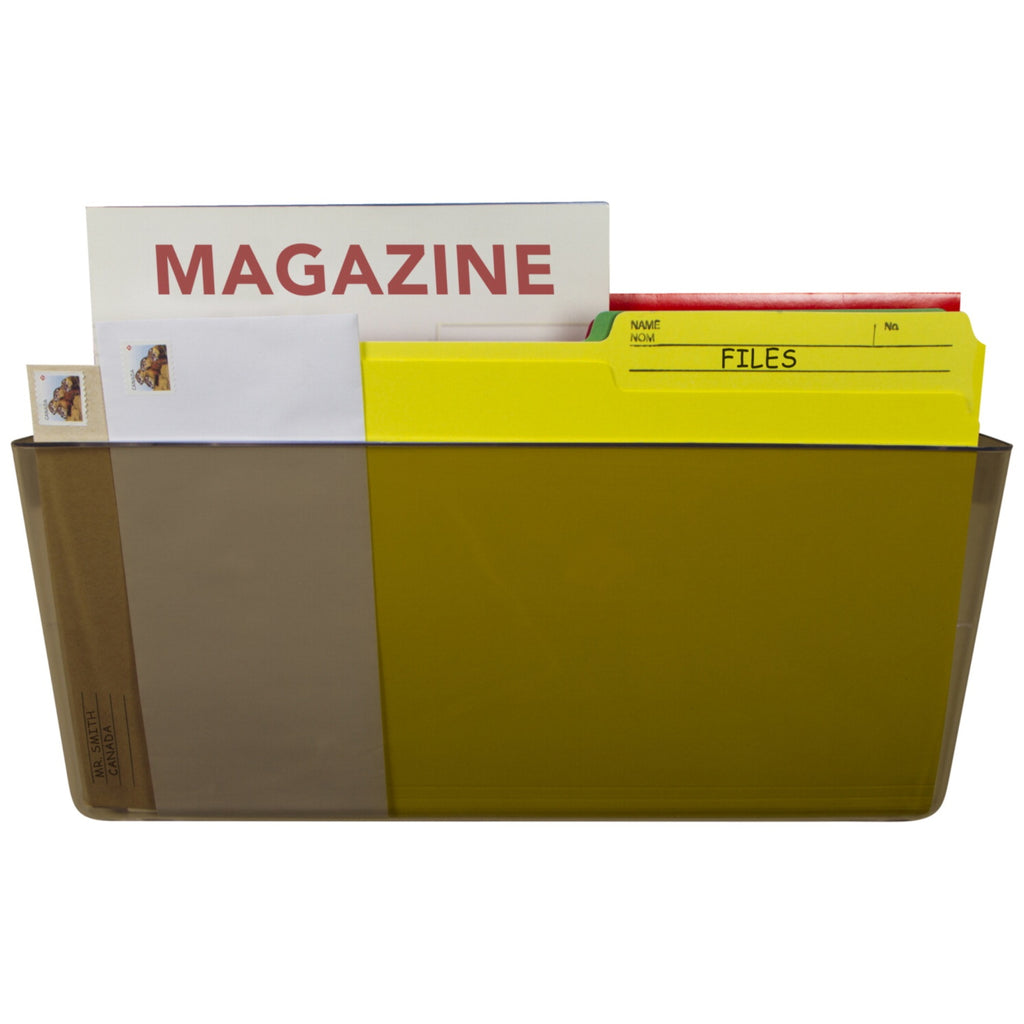 The Storex Wall File comes with three types of mounting options: wall anchors and screws, double-sided tape, and pocket clips, making it easy to install.