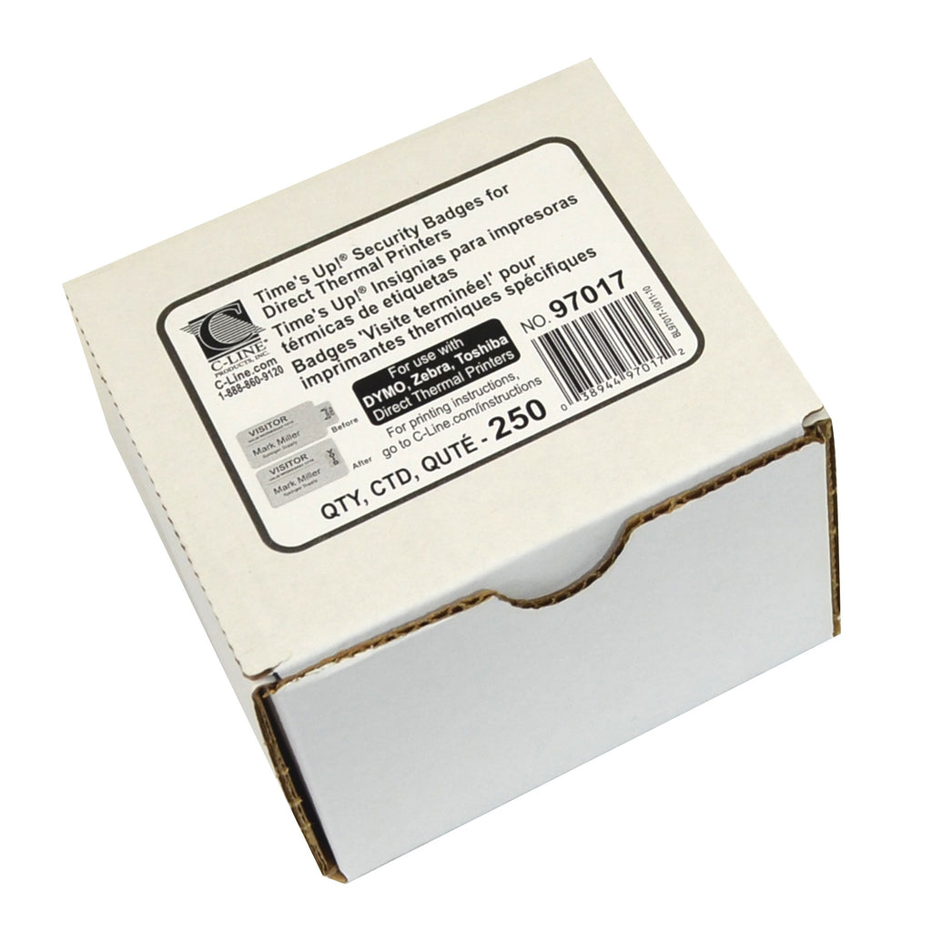 C-Line Time's Up! Security Badges are one-part self-expiring badges designed for direct thermal printers, measuring 2 x 4 inches, and are ideal for identifying individuals in various security scenarios.