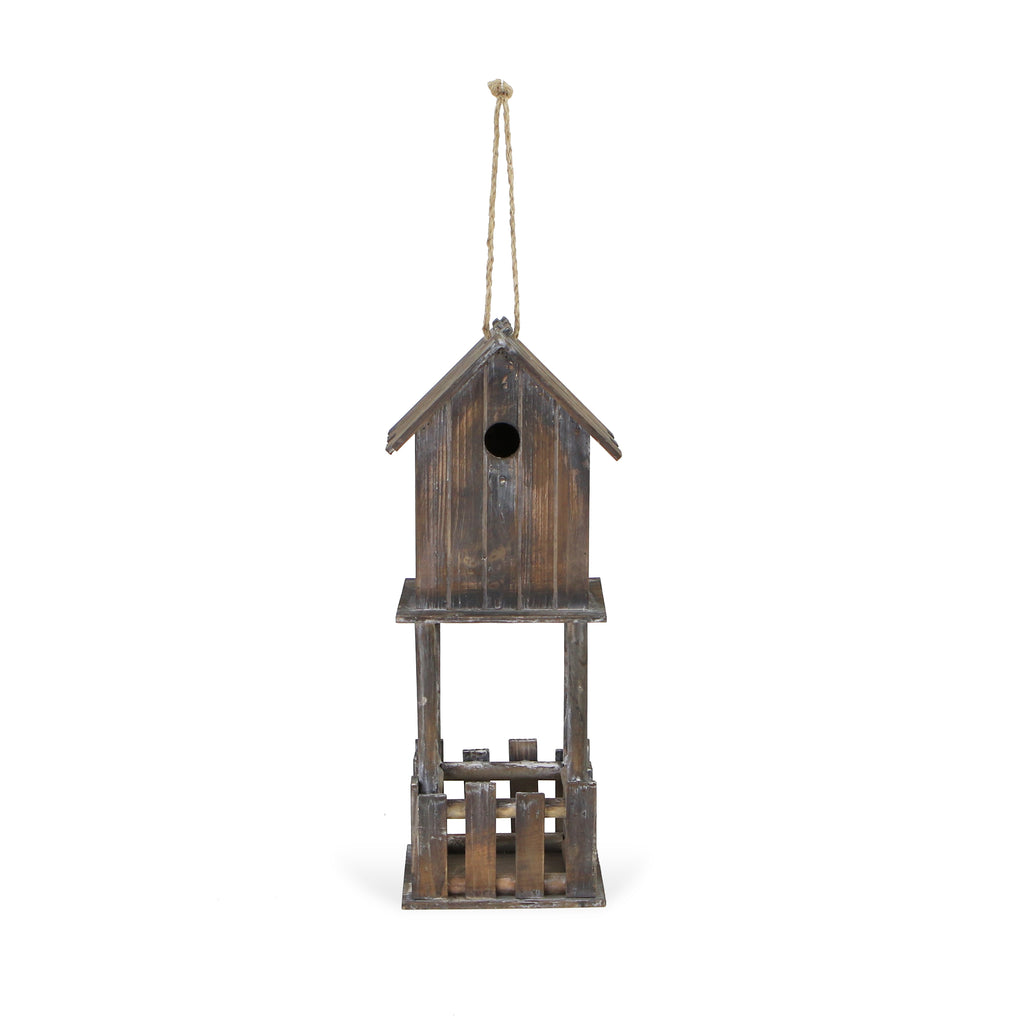 The birdhouse is brown with a distressed finish, providing a rustic look.