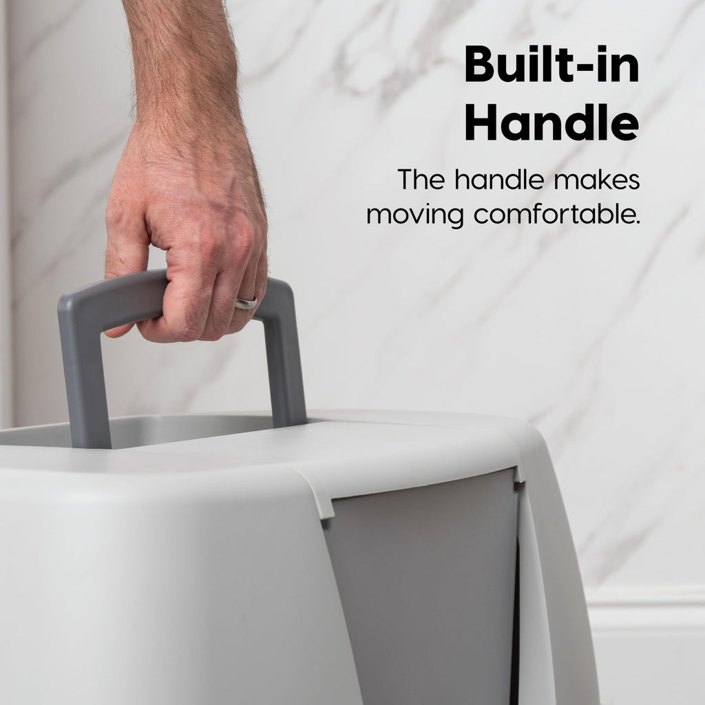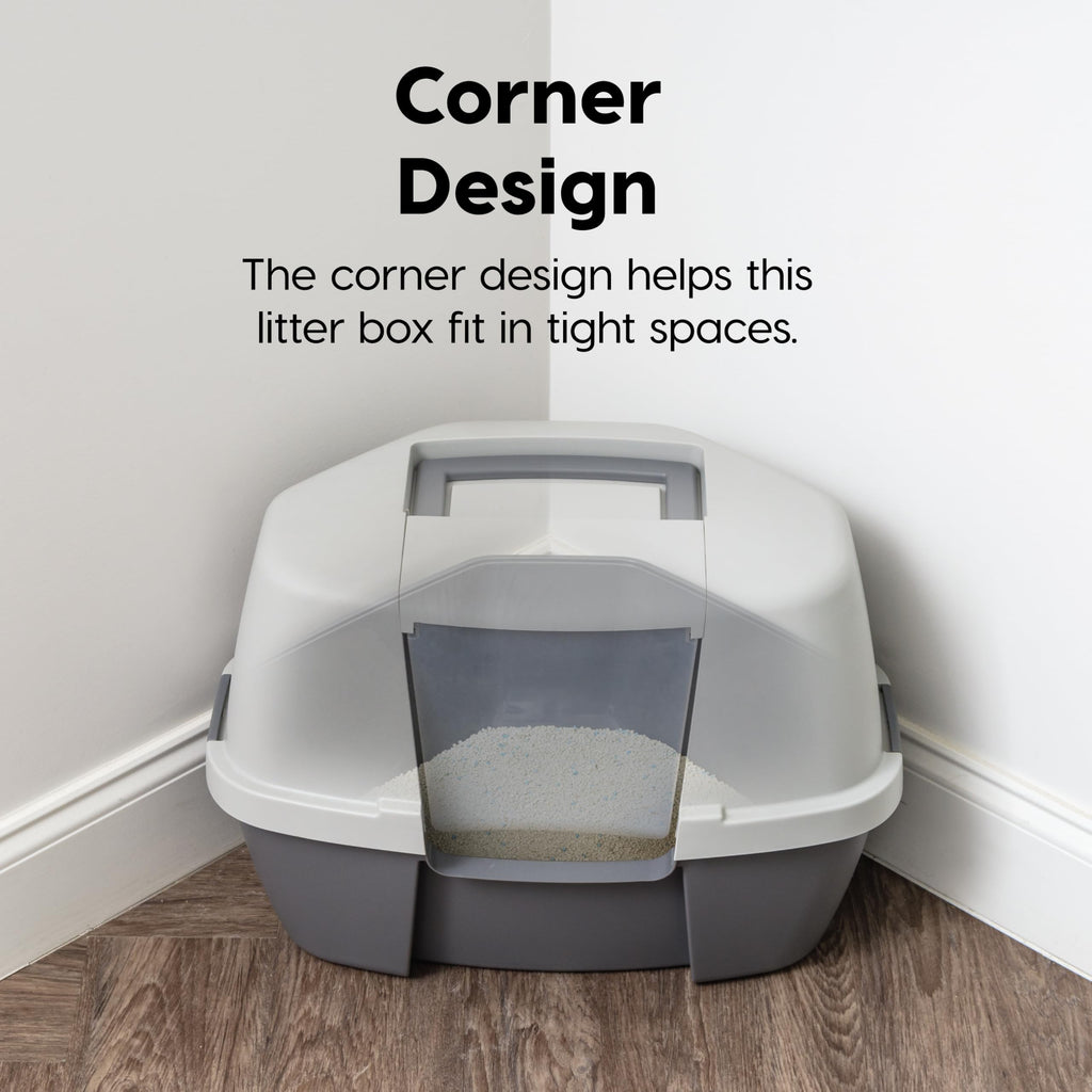 Make your space work for you and your cat. This angled cat litter box is designed to slip neatly into a Corner, while still providing plentiful room for your kitty to take care of business. The high sides, lid, and flap entry door Help keep litter and spray contained, and the curved bottom makes scooping it clean with the included scoop simple. Lid buckles securely to the cat litter pan bottom, and comfortable grip handle makes moving the cat litter box easy. Available in multiple styles and colors. Made in the USA.
