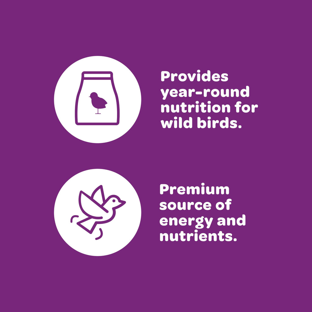 The blend includes high-energy ingredients like sunflower seeds, peanuts, mixed feed nuts, raisins, cherries, and other seeds that wild birds love.